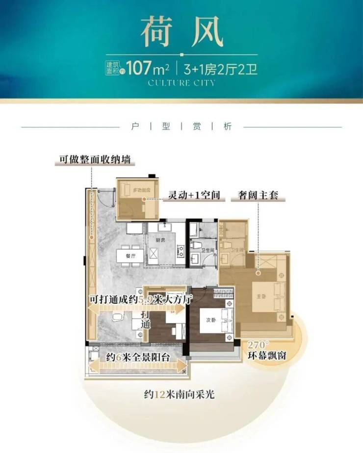 建面约107㎡的四房,拥有12米南向采光面,通透LDK一体化、约6米奢阔阳台,且带有独立入户花园。