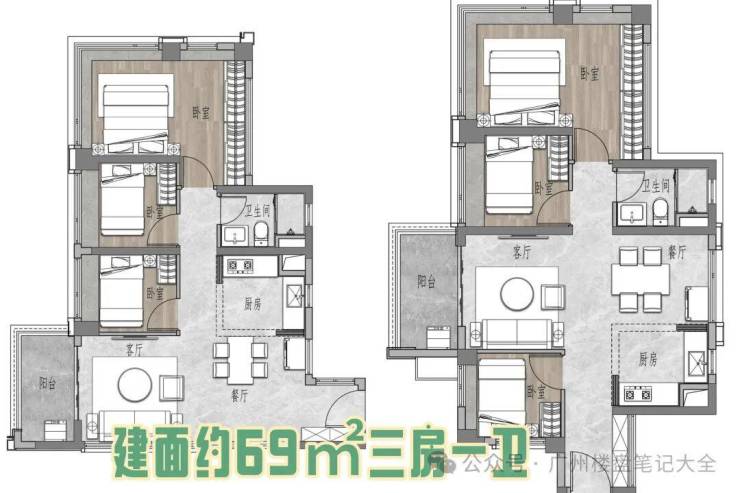 约69㎡三房一卫;