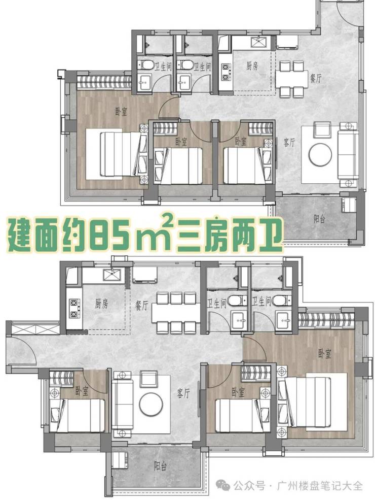 约80-87㎡三房两卫;