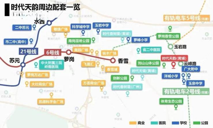 时代天韵所属的萝岗街道对口广州重点中学——苏元中学、科学城中学、铁英中学、省教育研究院黄埔实验学校(初中部)、北京师范大学广州实验学校(初中部)等。