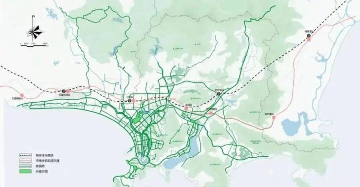 以三亚市生态网络为基础,依托山-海-河等景观资源,通过林荫道、公园绿地及滨水空间的生态景观修复与提升,形成“山环海拥、绿廊渗透”的开敞空间体系。