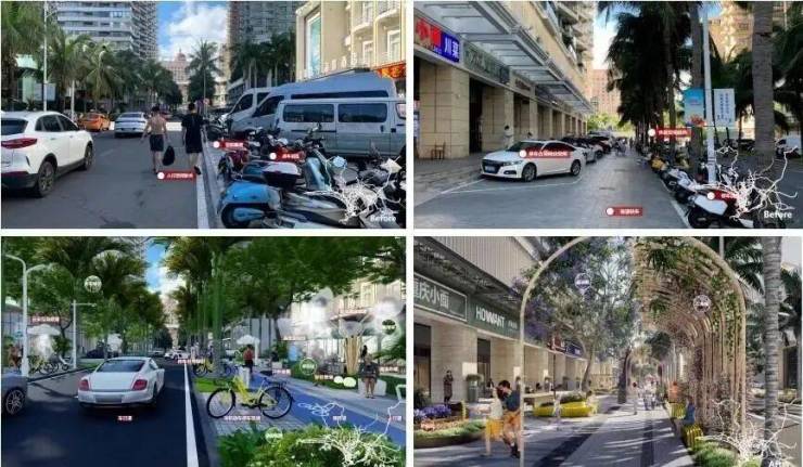 还人行道于行人。增加非机动车专属停车区域,整洁有序。配置智能降温装置、互动喷雾等智能街道家具,增加白天出行的清凉感。