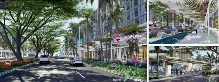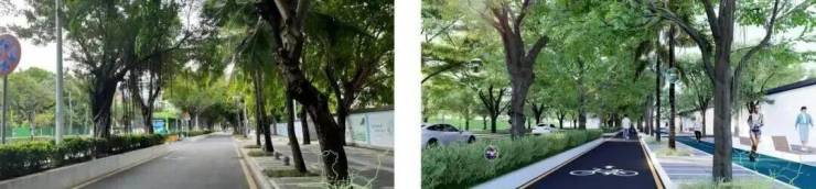 以植物藤架覆盖非机动车道和人行道,植物选用色彩明媚富有热带特色的花果,配合座椅等城市家具打造独具特色的街道空间。走走停停,赏花观果,遮挡烈日的同时又有趣味性和标志性。