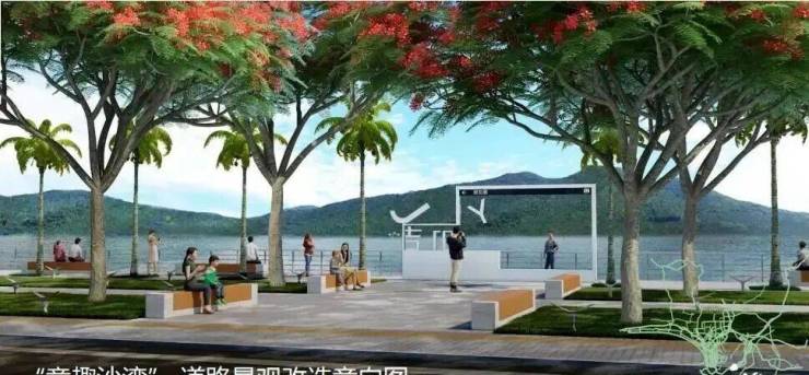 沿河增设取景框打卡点,拍摄三亚秀美山川。现状空闲用地增设户外休憩座椅和三亚元素地灯,为行人提供驻足空间。