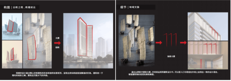 GOA操刀立面设计,在呼应琶洲CBD总部形象基础上,增添了属于华樾自己的建筑文脉特色。本项目故事线取自广州千年商都的城市文化,以及琶洲历史上丰富的船港文化,项目以“云帆之塔”为造型立意,整体塔楼呈现出类似帆船挺拔飘逸的形象,塔冠的塑造呼应了“帆”的造型意向;而中间避难层,则以空中花园的形式与裙房屋顶花园相呼应;底部裙房设计,则是从船的船舷汲取灵感,将船舷提取的元素与建筑的曲线结合,打造了退台式的甲板花园。