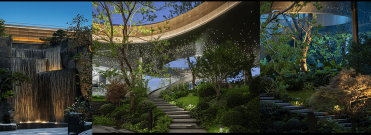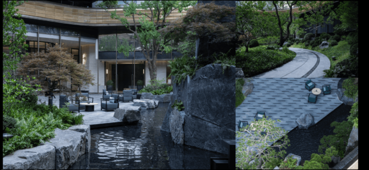 【灵感来源】在空间格局的设计上,借鉴苏州名园环秀山庄作为设计灵感,设置前厅后院,以小见大,将廊桥、水幕、树木、建筑等巧妙融合,创造前庭、中园、西苑、层台多种不同的园林风格景色。