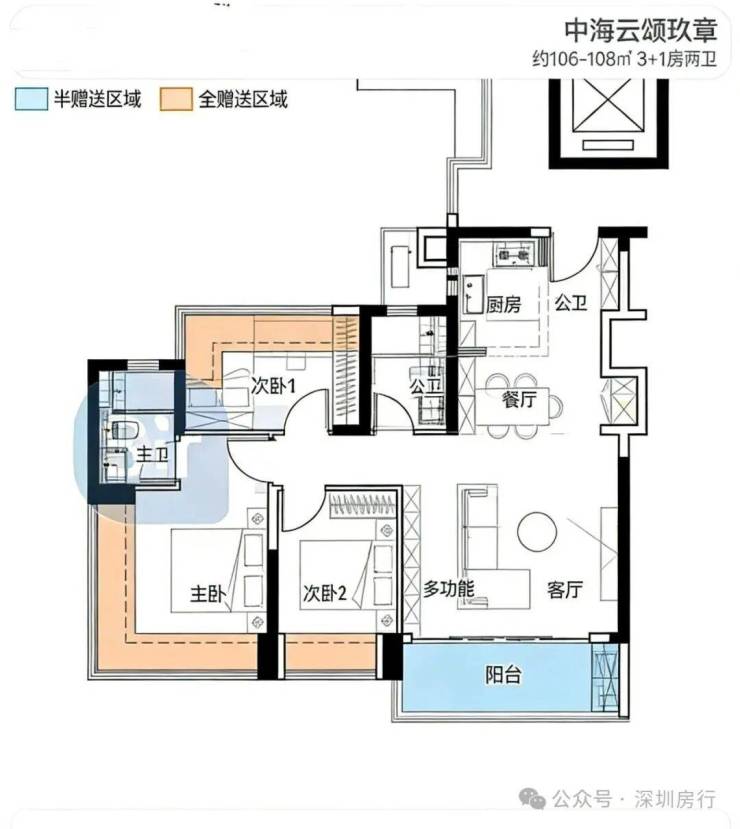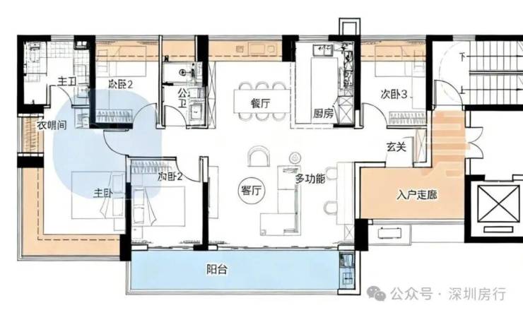 空间灵活,多功能房可改造为茶室、书房或儿童房;主卧带独立套间(卫浴+衣帽间),居住尺度舒适;横厅搭配观景阳台,视野开阔。