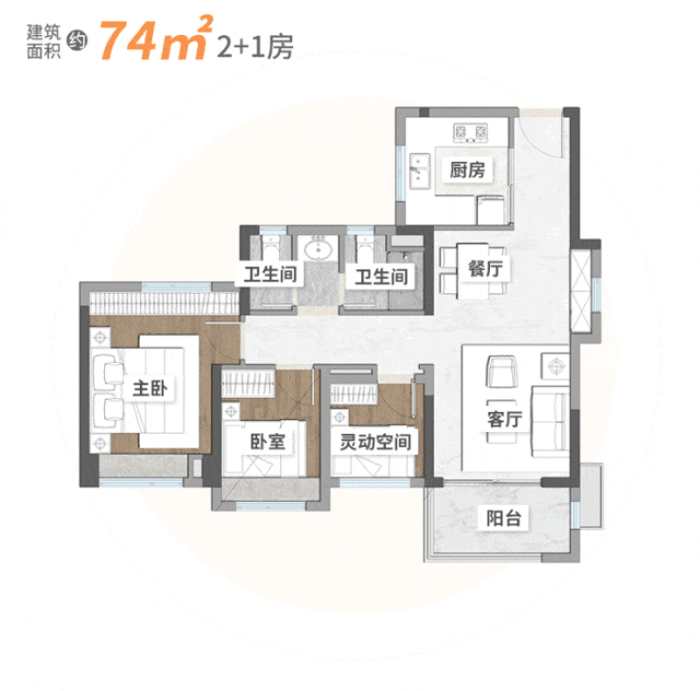 项目一期户型面积74-170㎡,三至四房设计,四开间以上朝南,通透性好。二期户型63-82㎡,小户型使用率最高达107%,在同等面积段中空间感更强。