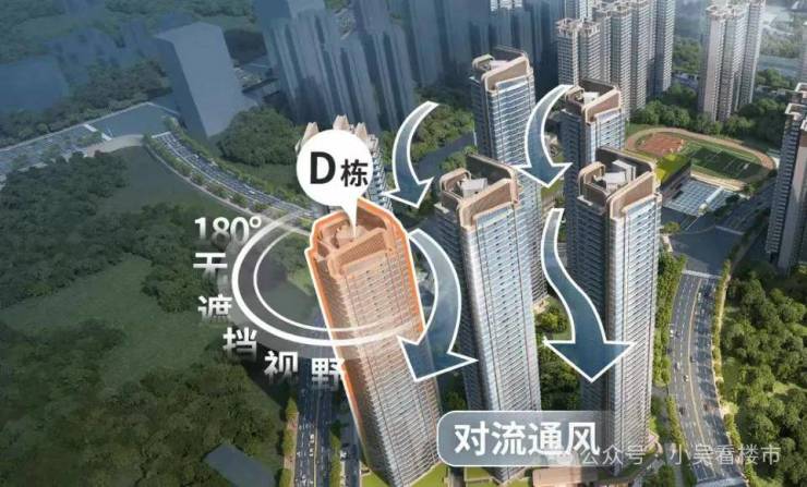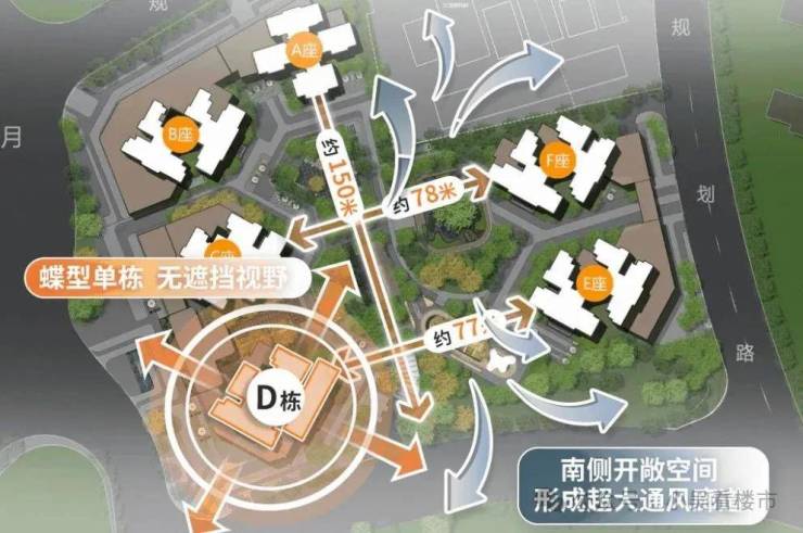 这样一来,整个小区楼间距,最大处直接超过150米!最小也有约70米+,为了给业主一片开阔养眼的窗外景观,项目还升级楼栋,设计成蝶型单栋,四面都能180°眺望,拉长视距,主阳台也不会存在对视问题。