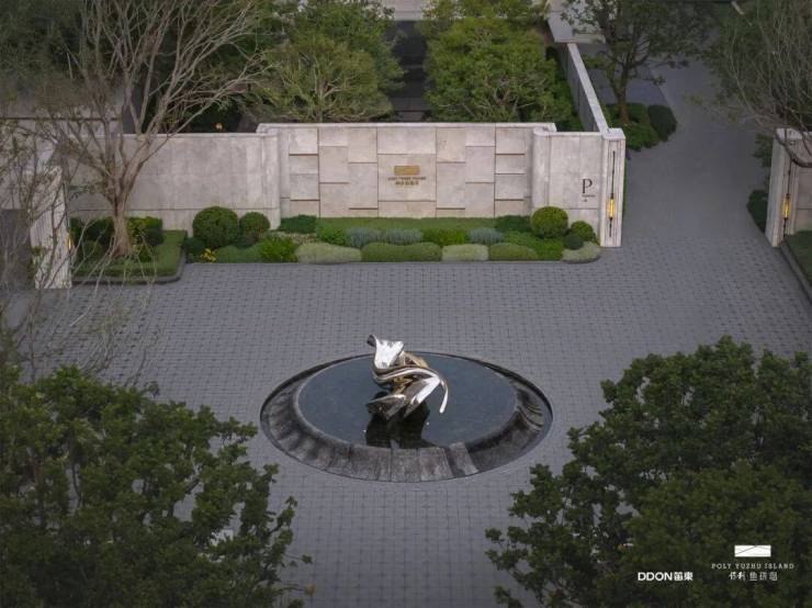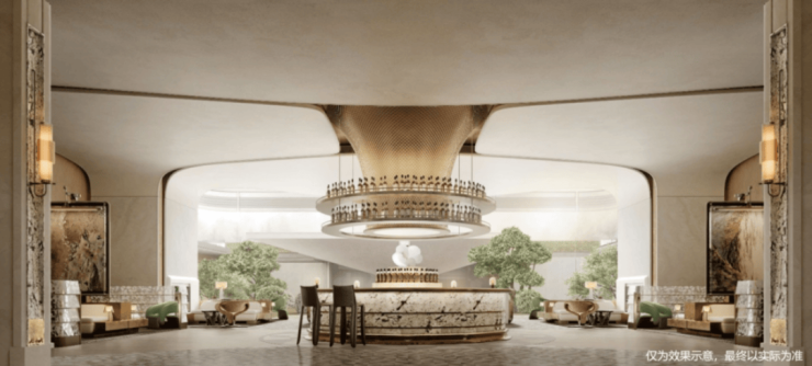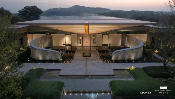 入口弧形景墙如徐徐展开的舷梯,构成从城市向江心自然过渡的序章。中庭以悬置的玉盘艺术装置为视觉核心,通过精确的光影切割,营造出静谧而永恒的内向焦点。整体选用灰调石材与金属材质,以克制肌理呼应江水的流动意蕴。
