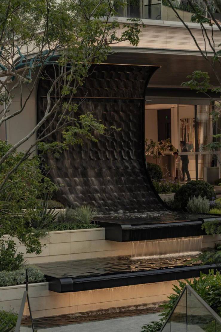 水脉相承,以之为礼。两侧叠瀑水景包裹于精致花境中,悄然划定私属疆界;原生大树与灵动水景交错相融,与自然过渡。
