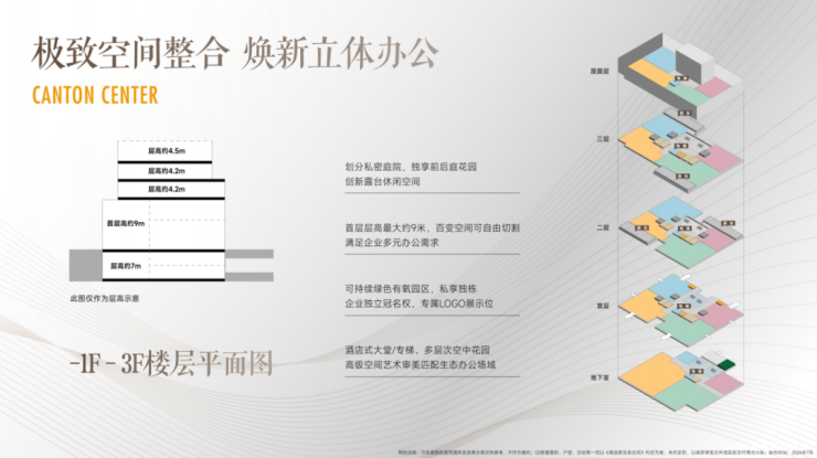 超高赠送、多变空间,酒店式独立专梯首层约9米层高大堂,尽显尊崇企业风范负一层约7米层高专属空间,电梯直达,可自由改造艺术展厅、阶梯路演等约4.5米天台花园,具备顶层酒会、宴会沙龙、户外泡池等多元需求