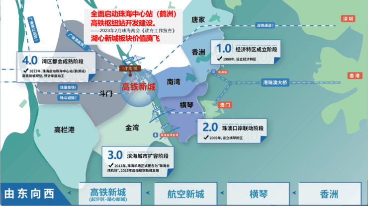 项目处于多维交通枢纽位置,一轴三桥环绕,即香洲大桥、洪鹤大桥、珠海大桥,15 分钟可到达珠海机场,20 分钟到达主城区,35 分钟到达澳门,50 分钟可达香港,一小时连接国际一线城市生活圈。