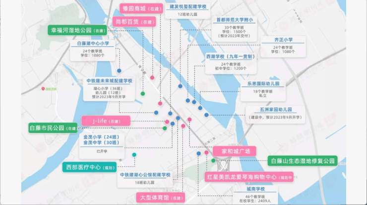 商业配套:自带约 5.1 万方 life style 主题式街区和约 1.2 万方邻里中心,周边还有家和城商业广场等,可满足居民的购物、娱乐等需求。