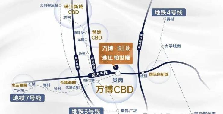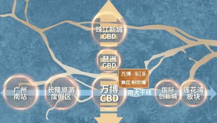 项目地处广州城市中轴&南大干线经济带双中轴交汇点——万博核心,南北CBD塔尖资源一脉尽享。