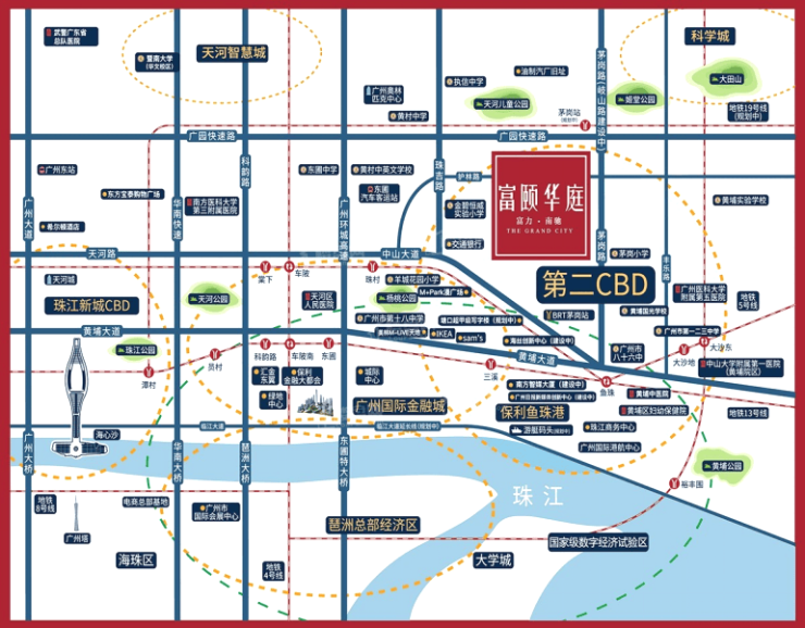 向外延伸,优托邦购物中心、天河城百货、美林M·LIVE天地、M+PARK漫广场等8大商业广场环伺,形成“便捷生活圈”。