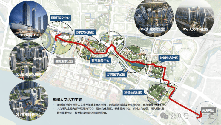 西至设施生态公园,东联南海神庙,构建串联TOD商业、文化街区、都市服务、国学公园、生态社区等重点项目的漫游活力轴,重点塑造“双岗TOD中心、都市服务中心”两大综合商业地标及“双岗、沙浦”两大休闲文化街区,目前双岗TOD中心已确认引入华润万象系商业运营