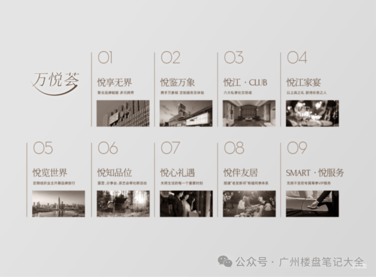【引领峯层时代的国际化生活平台——万悦荟】「万悦荟」整合多元业务领域,联手行业领先国际品牌,为业主带来系统化、定制化的全新滨江万象生活方式,包括:悦享无界、悦鉴万象、悦江·CLUB、悦江家宴、悦览世界、悦知品位、悦心礼遇、悦伴友居、SMART·悦服务9大权益。