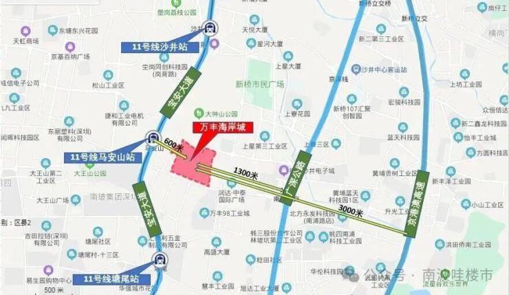 项目距离11号线马安山站直线距离约600米左右,距离项目最近的地方只有300米左右,目前11号线可与深圳地铁1号、2号、3号、5号、6号、7号、9号、12号这8条线路直接换乘。道路交通方面,项目附近有两条主干道,距离宝安大道直线距离约600米左右,距离广深公路约1.3公里左右,这两条主干道直接对接深圳外环高速,通过外环高速可快速驾车通勤深圳各区,较为便捷。另外项目距离京港澳高速直线距离约3公里,通过此高速路可通达全国各地。
