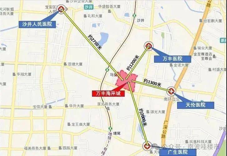 3km内沙井人民医院,项目1公里范围内分布有马鞍山社康,万丰社区社康,除此之外距离项目较近的两所医院是万丰医院和深圳天伦医院,日常小的身体不适可就近就医相对便利。离项目最近的大型公立医院是沙井人民医院,距离项目直线距离约2.75公里,距离稍远,缺少一定便利性,医疗借助交通工具通行。