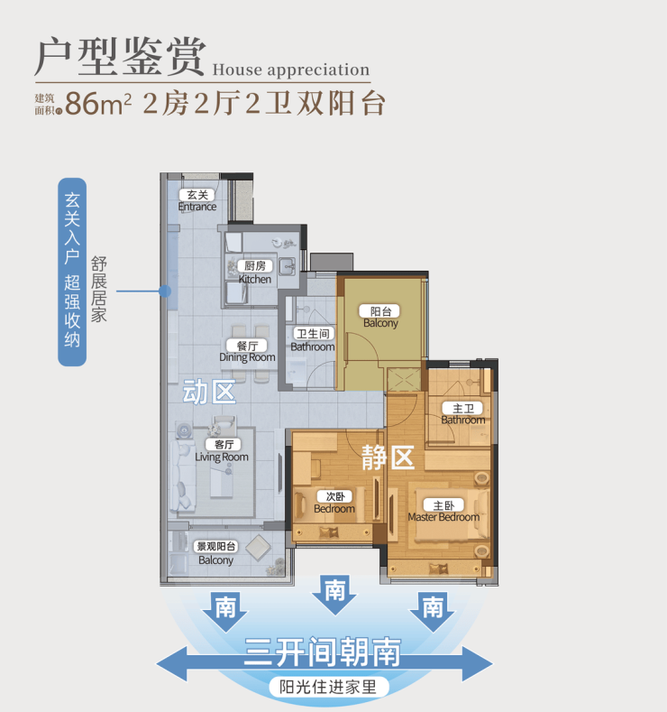建面约86m²东南向望园三房两卫,经典竖厅设计,南向正望园林