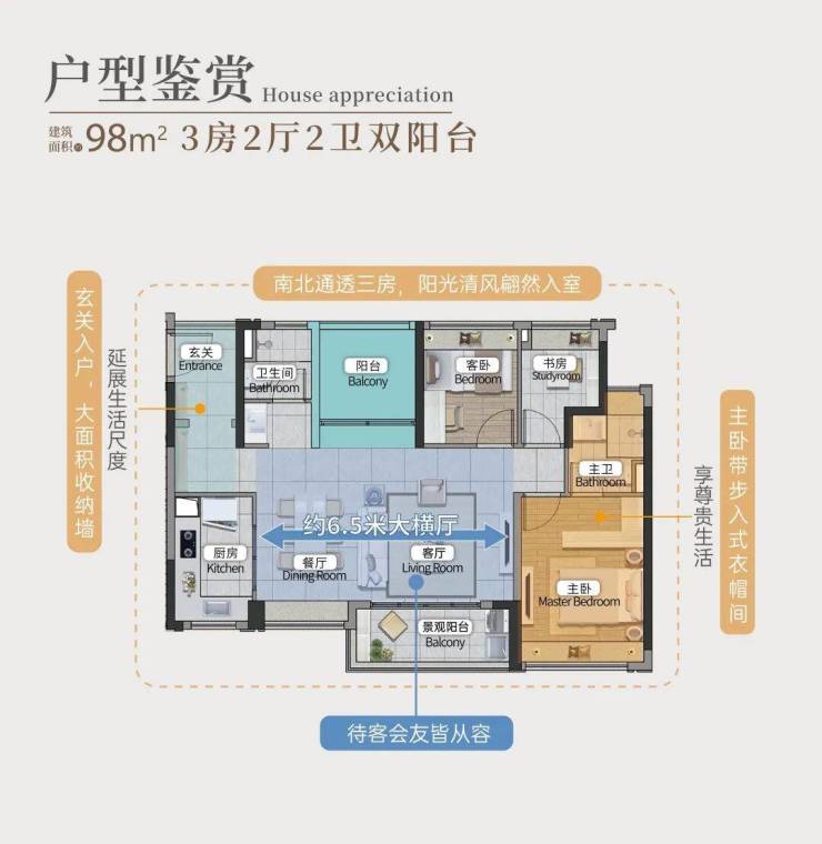 建面约98m²南北通透珍罕四房,约6.5米大横厅,待客会友皆从容