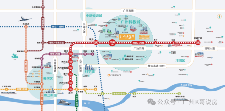 地铁快线1站到镇龙站,可接驳穗广深城际及新白广城际,北上白云机场,南下东莞深圳