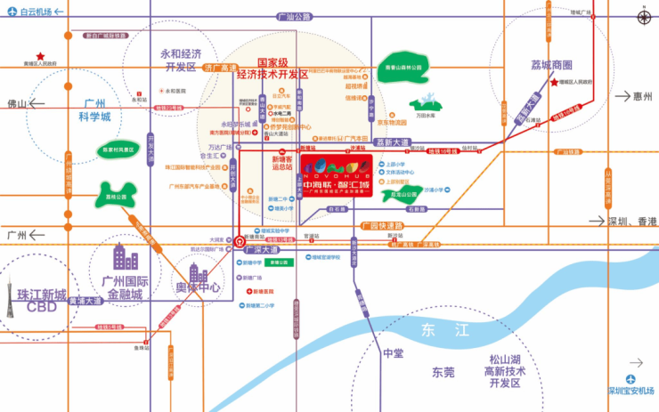 自驾——紧挨广园快速、开创大道、荔新大道等主干线,回广州市区和东行东莞等城市都方便;