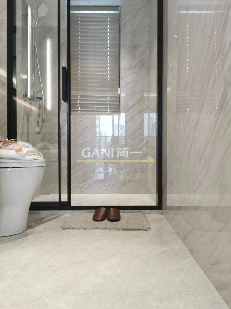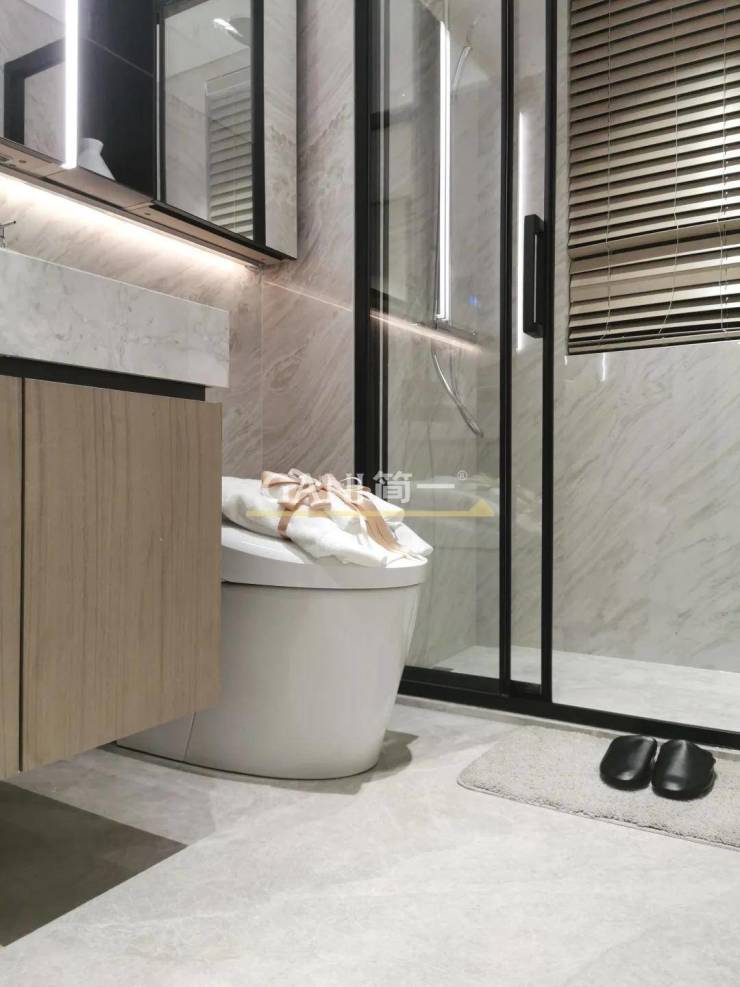 卫生间设计简洁利落,整个空间给人一种纯净的感觉。地面云棕灰没有过多的修饰,追求宁静与自在。