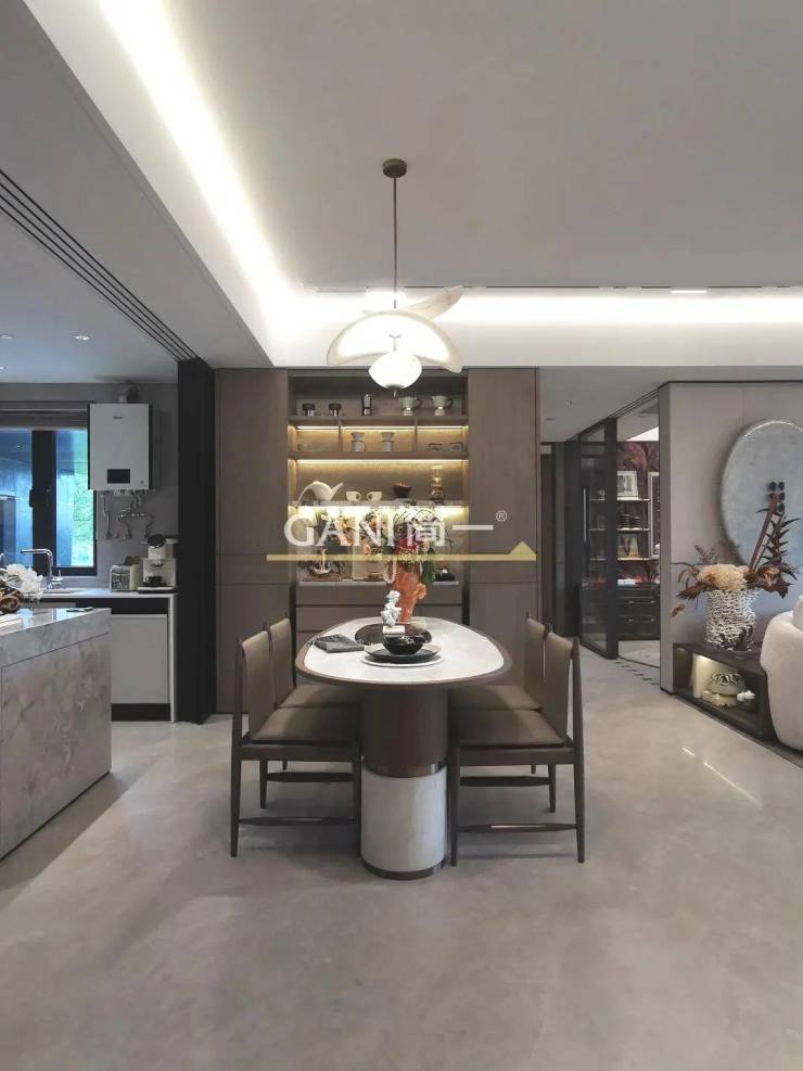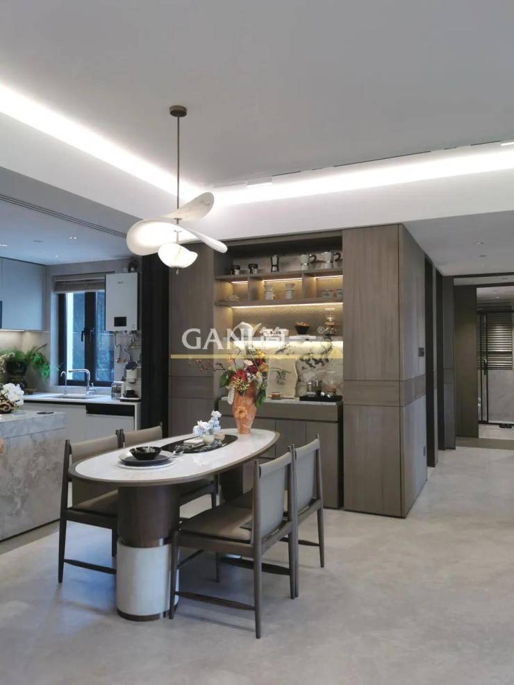 餐厅从颜值主义出发,拉满生活的仪式和品位。柔和而温馨的灯光营造出轻松愉快氛围,浅棕木饰餐边柜搭配地面云棕灰,展现高雅格调。