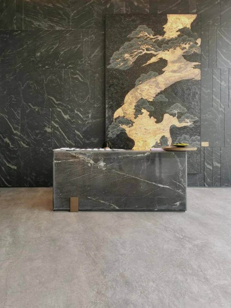 大堂前厅内,一幅由漆艺岩壁创作而成的巨大迎客松艺术画作熠熠生辉,流光溢彩的笔触使得整幅画作充满了生机与活力。地面搭配意大利云灰大理石瓷砖,灰白线条美感呈现于砖面之上,为空间叠加灵动自然感。