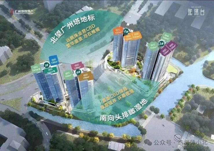 珑璟台为广州地铁独立开发,位于18号线龙潭站上盖,共分成两个地块,规划了4栋29-30层住宅,2号楼有两条梯腿(89-95的户型)为政府回购人才房,从沙盘上可以看出,1栋和4栋位于西边的地块,2栋和3栋位于东边的地块,两个地块之间规划了一条市政路,整体小区比较小,几乎没有花园,楼下三层是商业,四楼为架空层,未来电梯可直达地铁站,中间有一条市政道路,未来等红卫村旧改完成可直达琶洲,小区前面是海珠湖公园,北靠琶洲CBD,楼下是地铁站,去琶洲和珠城都很方便。