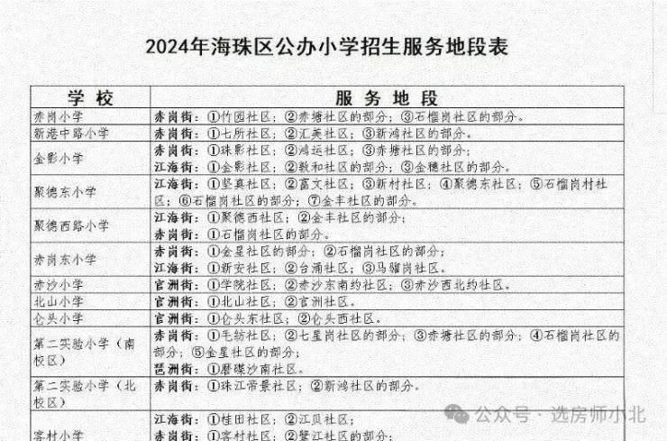 项目按预售证登记的街道社区来看,大概率上的是赤岗东小学,不过其教育质量相对一般。附近还有赤沙小学、海珠小学、海珠中学(市一级)、聚德中学等学校。2024年海珠区公办小学招生服务地段表中,众多小学的服务地段涵盖了周边社区,还有项目西侧规划建设一所18班的中学,未来有望解决全龄段教育问题。