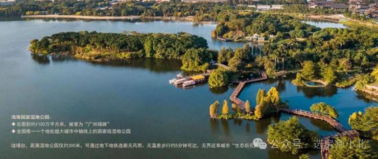 项目南瞰超万亩海珠国家湿地公园,该公园是全国唯一超大城市中轴线上的国家级湿地公园,被誉为 “广州绿肺”,为居民提供了优美的自然景观和清新的空气。
