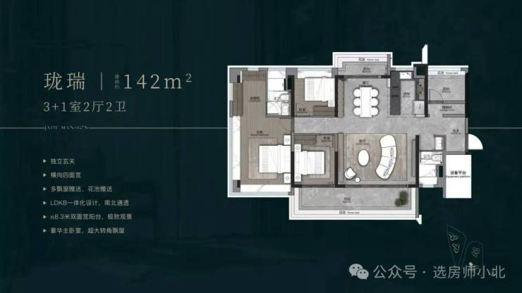 如设备空间、厅卧都可做灵活空间,相当于在三房基础上,再多两个多功能室,这是同面积段户型无法匹及的格局。