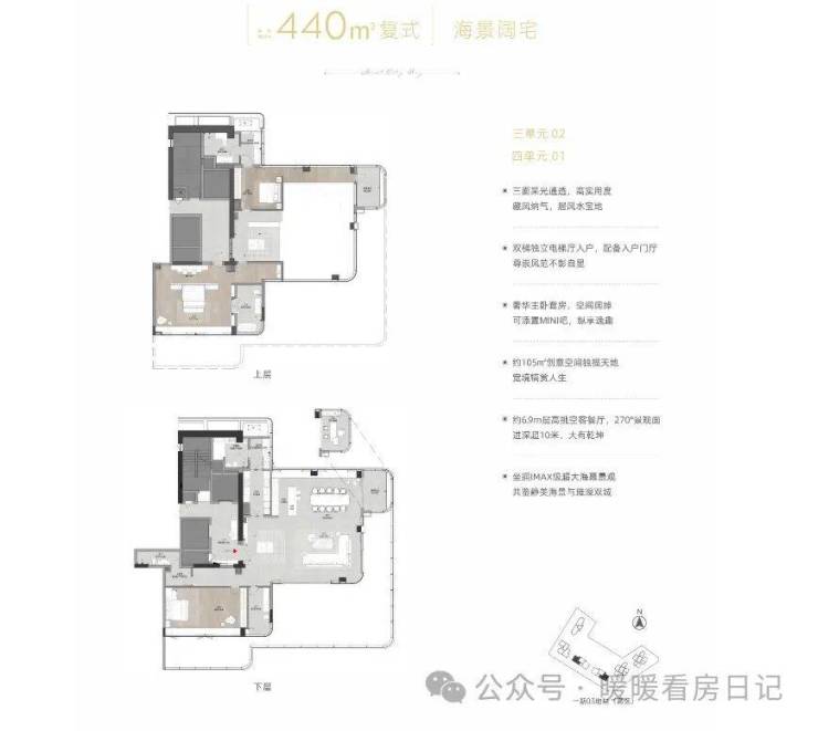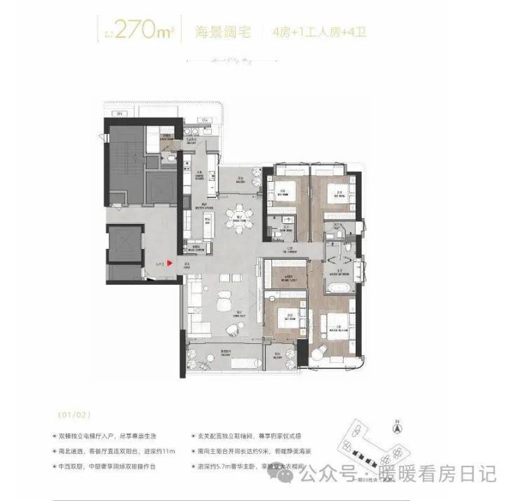 ·玄关配置独立鞋帽间,尊享归家仪式感·南北通透,客餐厅直连双阳台,进深约11m南向主阳台开间长达约8.7m,俯瞰静美海景·中西双厨,中厨奢享阔绰双排操作台·进深约5.7m奢华主卧,享独立大衣帽间。
