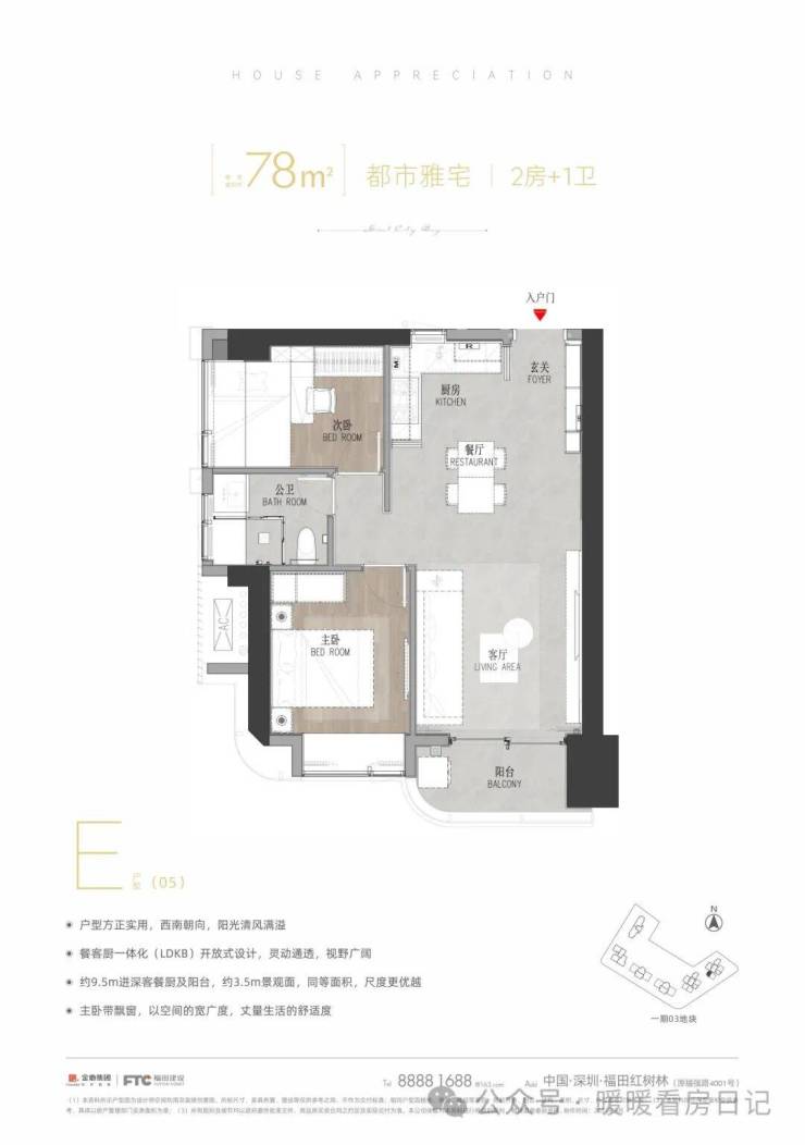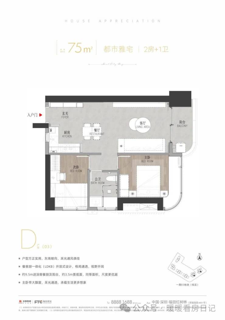 D户型:建面约75㎡,2房2厅1卫,竖厅,动静分区结构,整体比较传统,两开间是优势朝向,这个户型货量比较少,具有低总价优势,对刚需上车群体比较友好。