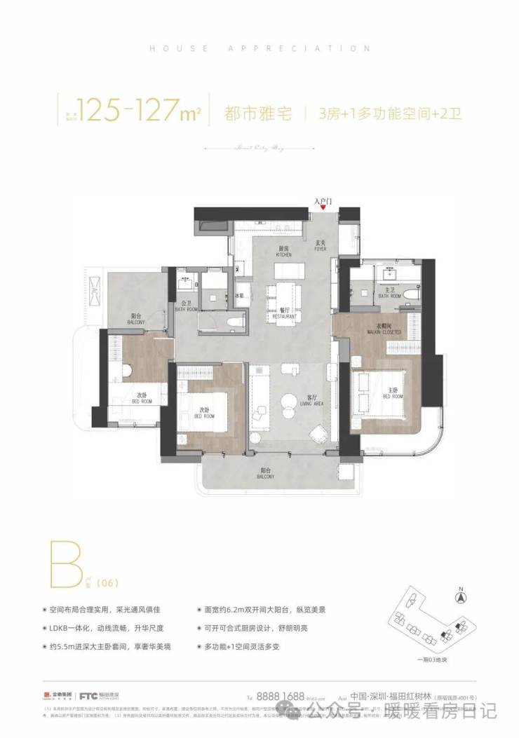 B户型:建面约125-127㎡,3+1房2厅两卫,竖厅、双龙抱珠结构,主卧套间设计、左侧次卧上方阳台可以改造为书房、儿童房均可,相较于A户型缺失的是居家静溢性,但它的可塑性更强,更加实用。·空间布局合理使用,采光通风俱佳· LDKB一体化,动线流畅,升华尺度约5.5m进深大主卧套间,享奢华美境·面宽约6.2m双开间大阳台,纵览美景·可开可合式厨房设计,舒朗明亮。