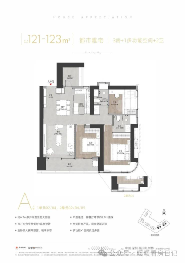 A户型:建面约121-123㎡,3+1房2厅两卫,竖厅、动静分区结构,户型方正,大开间短进深,3开间优势朝向,配套宽景阳台,如有需要生活阳台加以做房间使用。·约6.7m双开间观景超大阳台·户型通透,客餐厅尊享约7.9m进深·可开可合中西餐厨+岛台设计·全优卧室产品,尊享舒适进深·主卧设大拐角飘窗,悦享从容·多功能+1空间灵活多变。