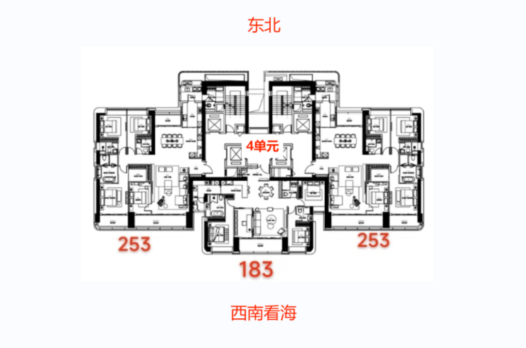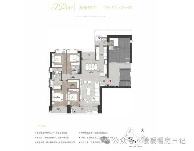 建面约253㎡海景阔宅4房+1工人房+4卫·近15m开间、超豪华南北通透多阳台·双梯独立电梯厅入户,独享尊崇生活·奢享约11m进深客餐厅、西厨一体空间·奢阔主卧,独立海景阳台+衣帽间+豪华主卫·全优次卧,双套房设计,尺度奢适·中厨、家政阳台及工人房功能一体贯连。