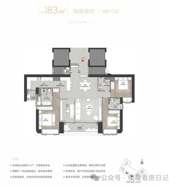 约183㎡4房2厅3卫双套房,分布在三单元03户型5-25楼,专梯入户,中西厨一体化设计
