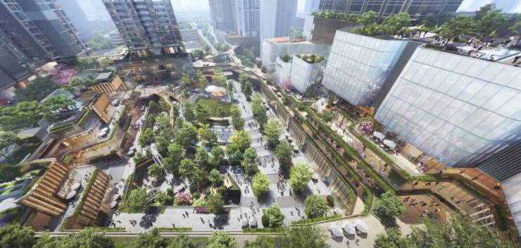金地环湾城的设计理念强调“垂直生态”。商业部分采用“多重森林”概念,以绿地公园为核心,将商业的森林向塔楼立面上延续,打造一个绿色的向上生长的生态之城。