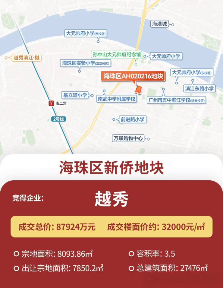 2025年1月底,越秀地产以总价8.79亿、折合3.2万/平的地价拿下地块,拿下2025年广州土拍第一拍。