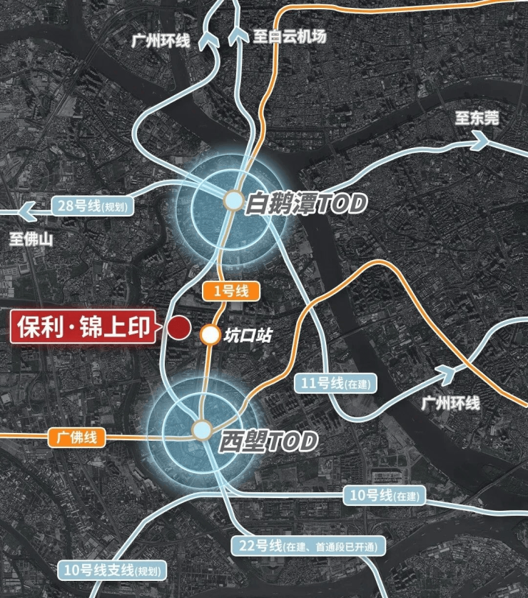 距1号线坑口站直线距离约仅约880米,步行 13-15 分钟可达,2站即达双TOD(西朗及芳村),快速通达海珠越秀,道路交通及公交路网完善,享30分钟城芯生活圈。