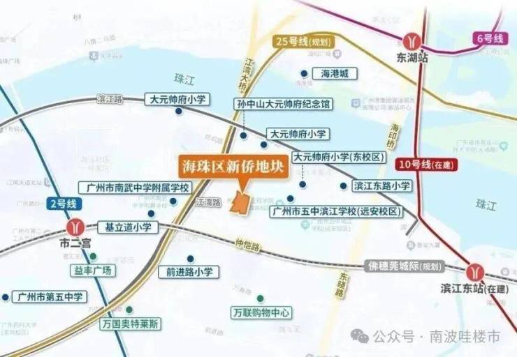 1 公里内有大元帅府小学(市一级)、滨江东路小学、广州市第五中学(省一级)等,配建幼儿园规划中,但优质公立小学对口尚未明确,存在一定不确定性;