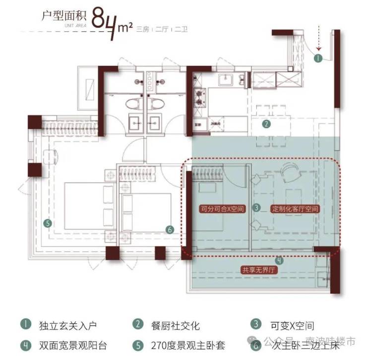 4.5开间朝南提升舒适度。全天候自然通风设计。中心化餐厅+灵活X空间,拓展生活场景。270度观景主卧套诠释精致生活,套房化设计强化舒适感。