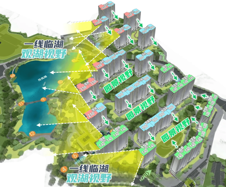 4,景观不错,45-52米的低密度小高层,按照“前低后高”的建筑高度控制,形成朝向湖区梯级跌落的设计,大地块西北向望湖景,小地块西向往湖景。