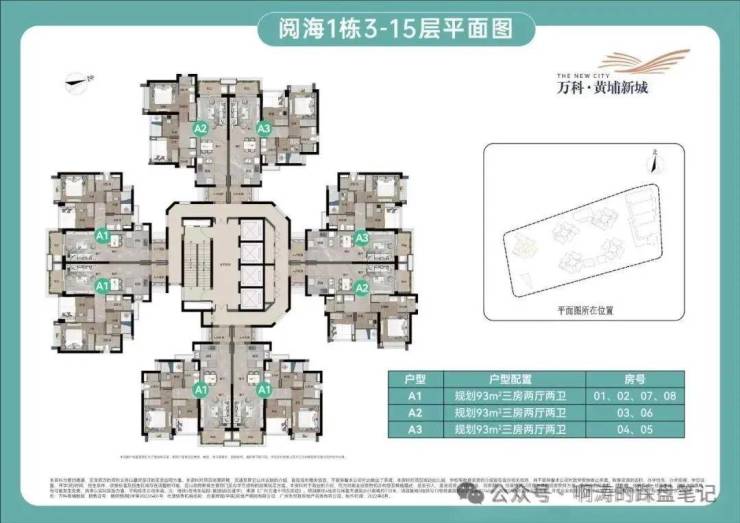 约93㎡南向3房,约93㎡北向3房。