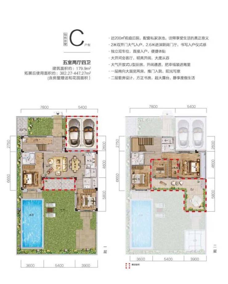 五室两厅四卫,建筑面积约179.90㎡,拓展后使用面积约411.99—476.99㎡(含房屋赠送和花园面积