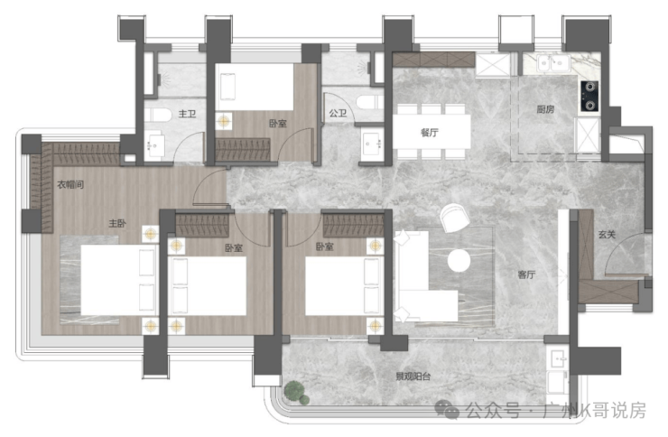 138㎡四房户型,做到了四开间朝南,约16.6米大面宽,而且餐厅带飘窗,做到了南北对流,主卧还配置了独立衣帽间和超大收纳柜,很适合二胎家庭居住。